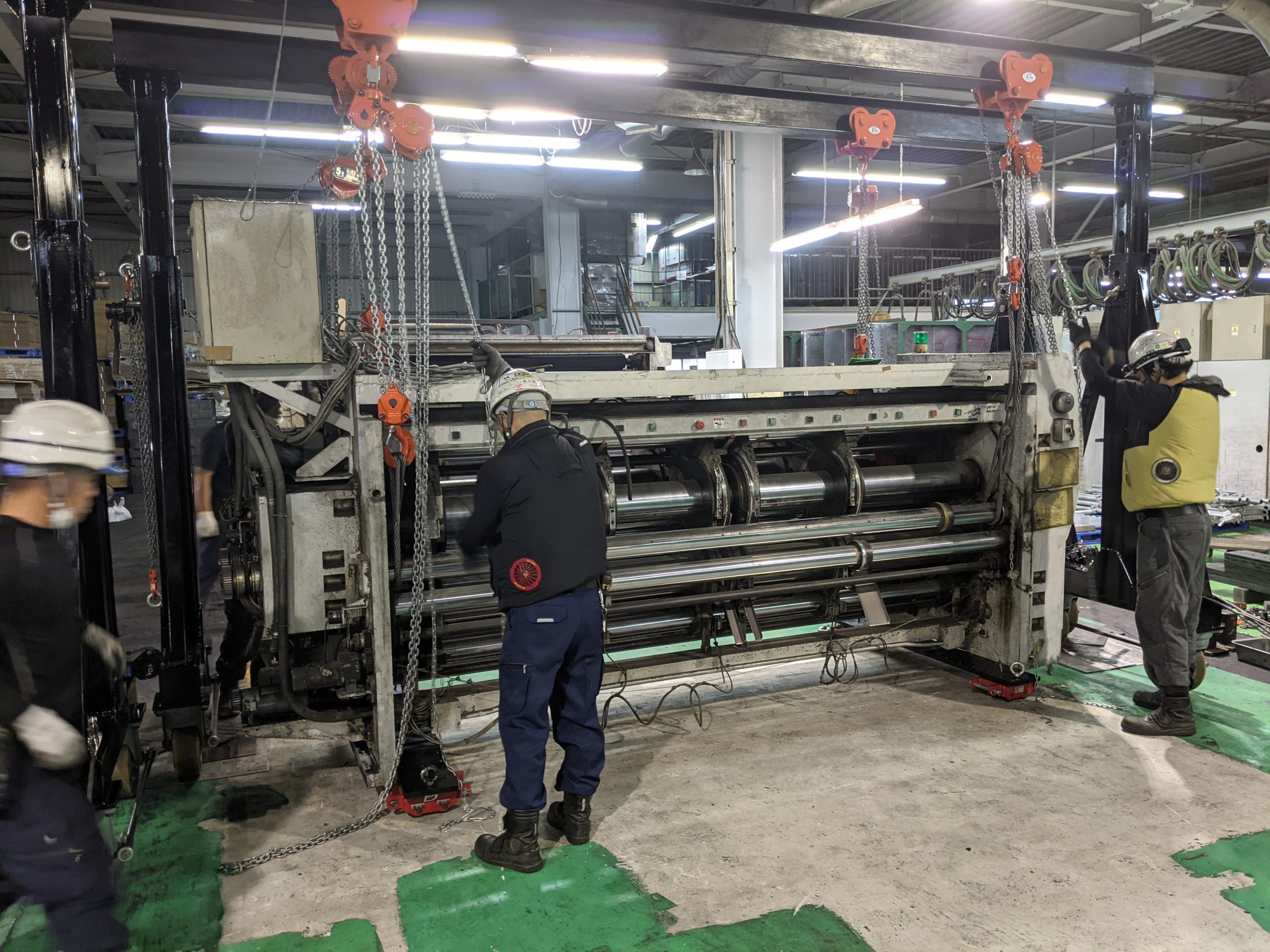 製函機重量 5t〜12tの重量物でしたが、専用道具を使い、安全に搬出工事完了しました。