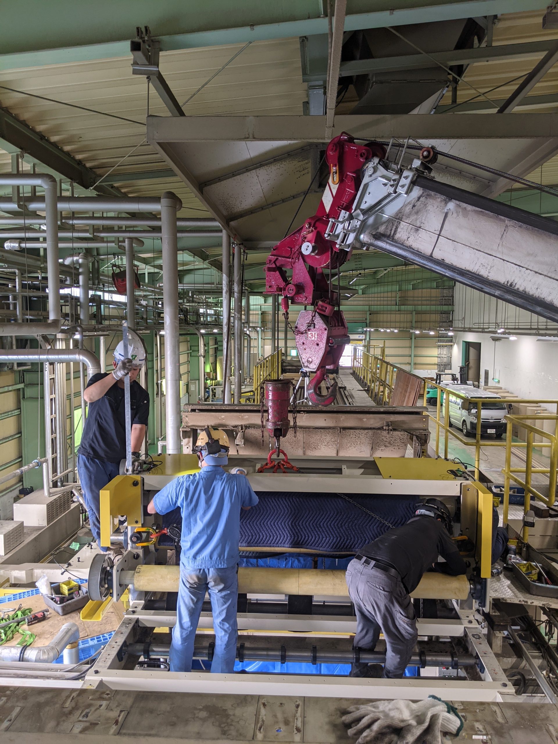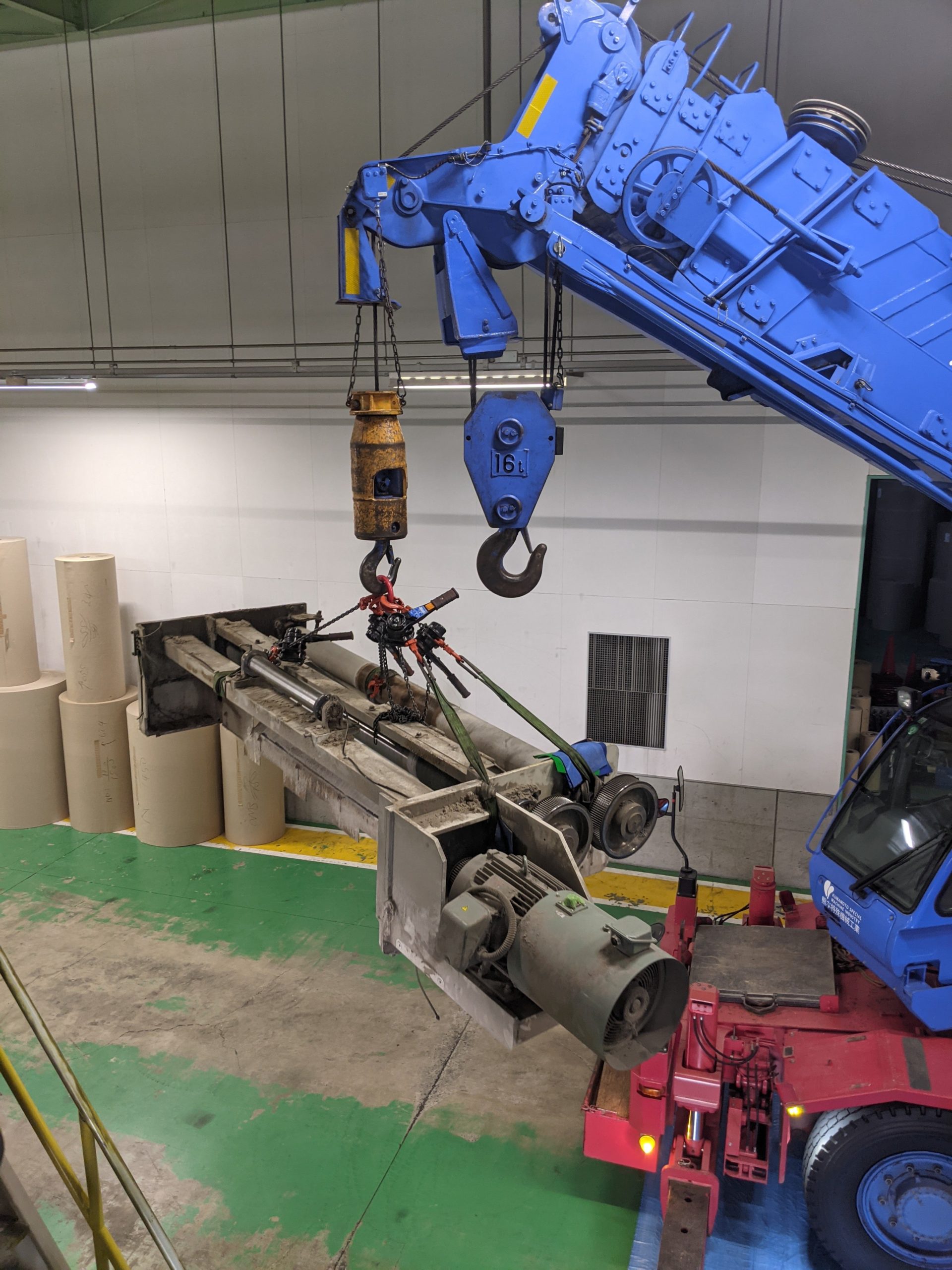 工事内でのクレーン作業は吊りしろの許容範囲が限られてしまうので、機械の玉掛けがどうしても難しくなりますが、そこは弊社の強み 経験、計算、シュミレーションを用いてお客様にもメーカー様にも安心して作業を任せて頂きました。