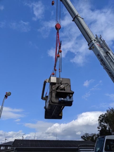 80tクレーンの作業半径能力いっぱいでしたが、本体重量26t……無事に荷降ろし・搬入完了しました。変重心の機械は機械吊り作業でバランスを取ることが難しい機械ですが、そこは弊社の強み 経験と実績で安全に荷降ろし作業を行います。