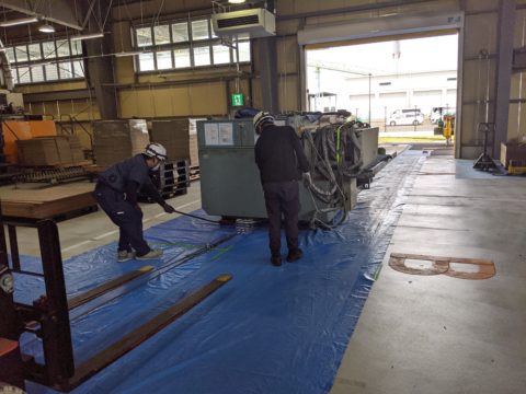 今回はクレーン作業もあり、新工場のアスファルト舗装が新しく、重量物を横引きする際 沈んでしまうリスクがありましたので クレーンアウトリガー接地面並びに、搬入口前を敷鉄板で養生して少しでもリスクを取り除き作業させて頂きました。