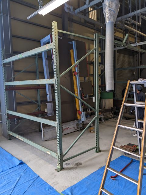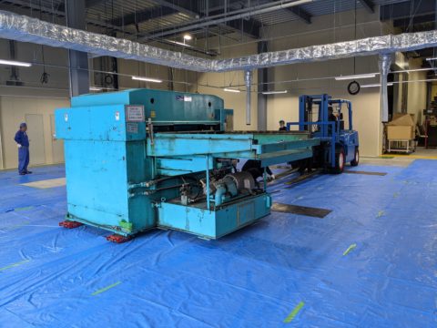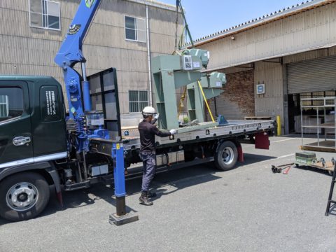 今回の機械はMAX重量16tあり、搬入口がアスファルトの軽いスロープだった為、機械重量にてアスファルトの陥没等、想定外が起き作業が遅延しないよう弊社にて搬入ステージを作り傾斜をフラットにして移転作業を行いました。