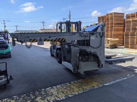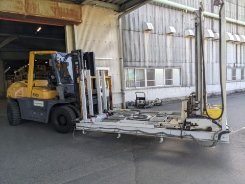 今回は不安定な機械を傾斜のキツイ場所を横引きする危険性を無くす為、フォークリフトに固縛しての搬出工事になりました。